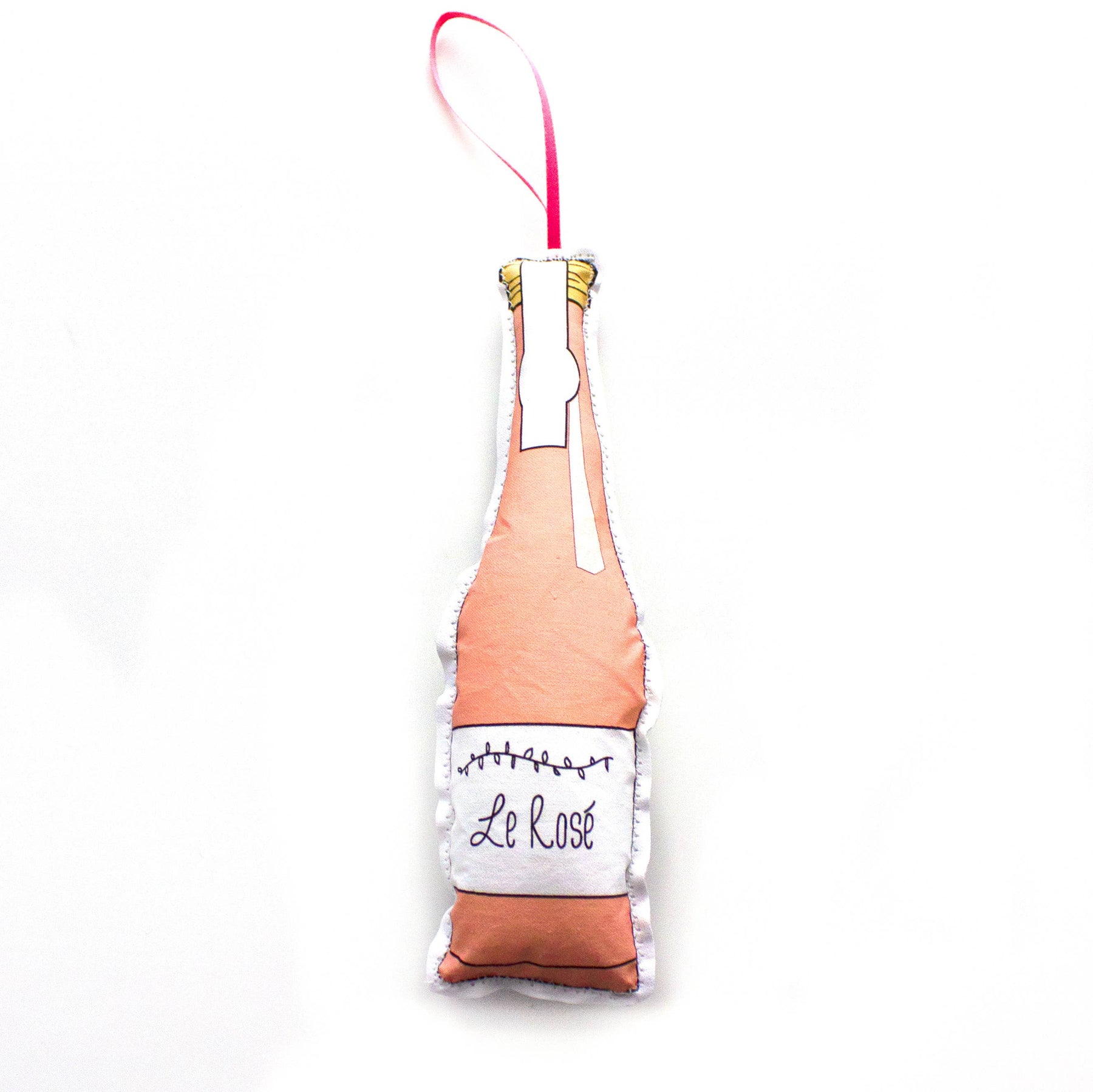 Add some fun and charm to your Christmas tree with this adorable Rosé bottle ornament. Featuring an illustrated print of a Rosé wine bottle. It is filled with soft poly fill to create a puffy look. The back is covered with a white fabric. Size: 7 X 2"