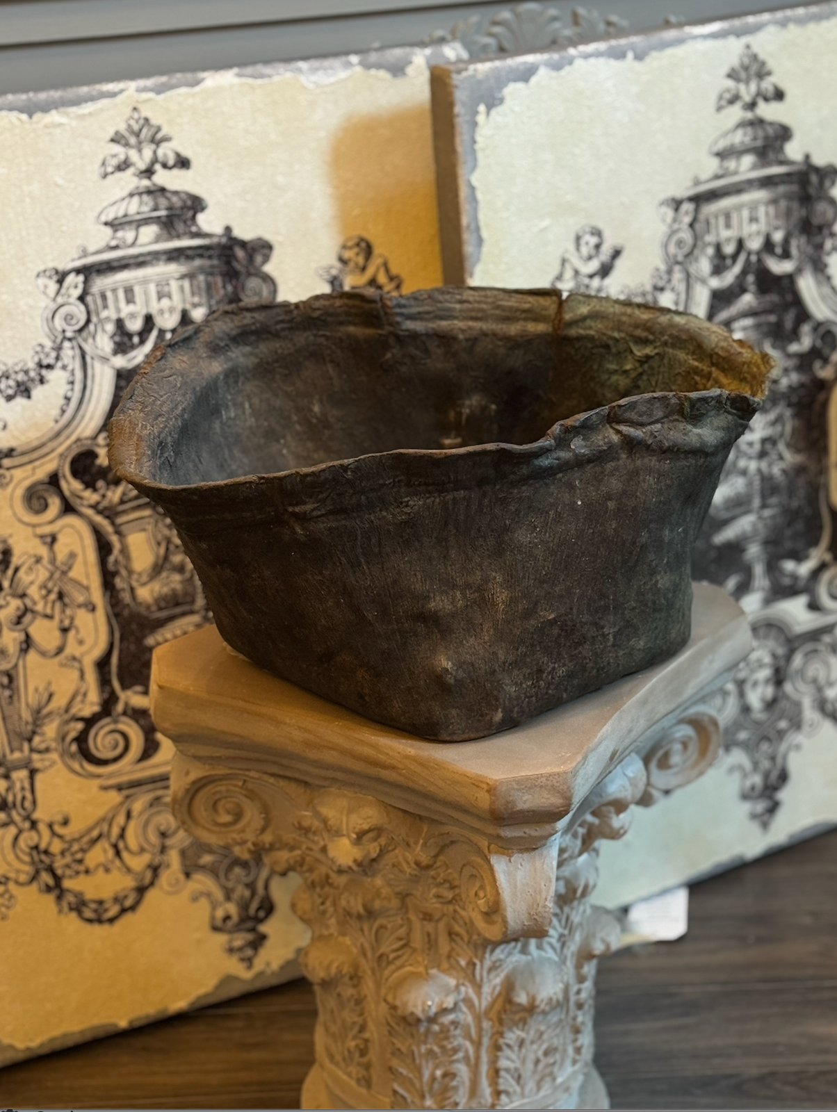 Vintage leather bowl. Approximate Dimesnsions: 16" - 19"x  7" Tall